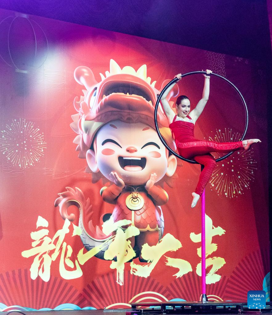 An acrobat performs to celebrate the Chinese Lunar New Year in Sun City, North West Province, South Africa, Feb. 10, 2024. (Xinhua/Zhang Yudong)