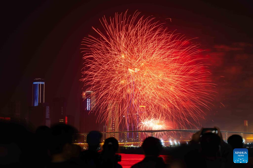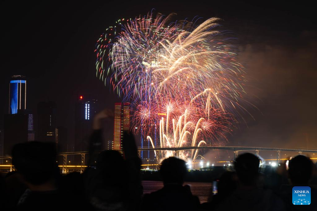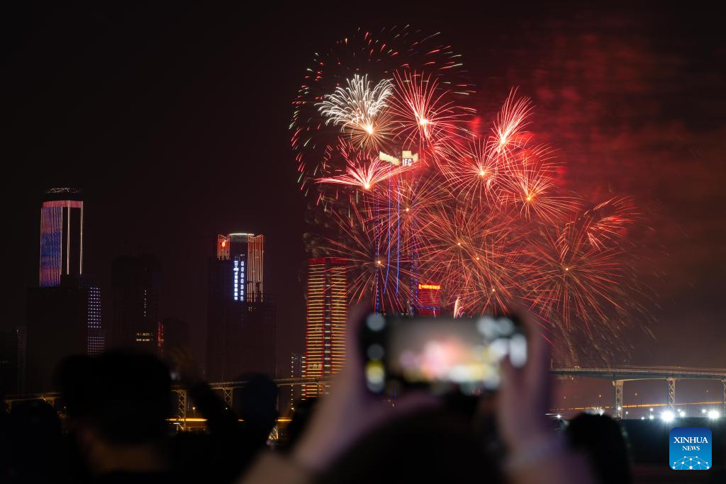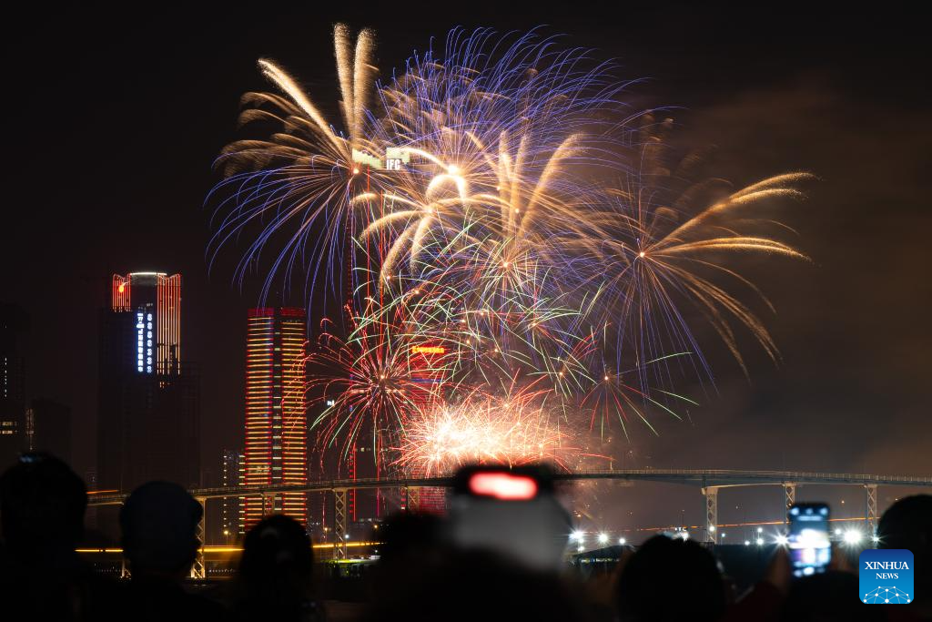 Fireworks in celebration of the Spring Festival illuminate the sky in Macao, south China, Feb. 12, 2024. (Xinhua/Cheong Kam Ka)
