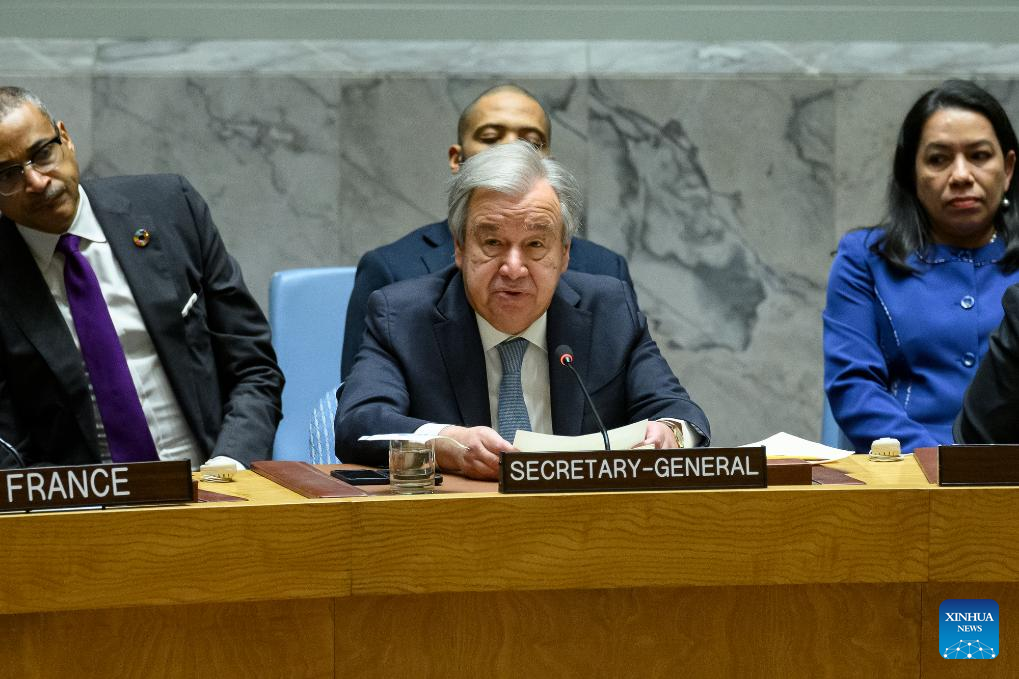 UN Secretary-General Antonio Guterres (C, Front) addresses the Security Council high-level open debate on the impact of climate change and food insecurity on the maintenance of international peace and security at the UN headquarters in New York, on Feb. 13, 2024. Guterres on Tuesday urged a worldwide response to the challenges posed by climate-driven food insecurity and conflict. (Loey Felipe/UN Photo/Handout via Xinhua)