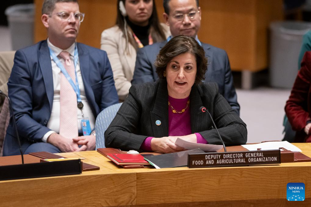 Beth Bechdol (Front), the Deputy Director-General of the Food and Agriculture Organization (FAO), speaks at the UN Security Council high-level open debate on the impact of climate change and food insecurity on the maintenance of international peace and security at the UN headquarters in New York, on Feb. 13, 2024. Bechdol on Tuesday underscored the urgent need to address the intertwined challenges of climate change and conflict to combat global food insecurity. (Manuel Elias/UN Photo/Handout via Xinhua)