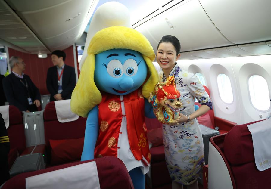 A staff member poses with a smurf costumed character wearing traditional Chinese clothes at the Brussels Airport in Zaventem, Belgium, Feb. 9, 2024. (Xinhua/Zhao Dingzhe)