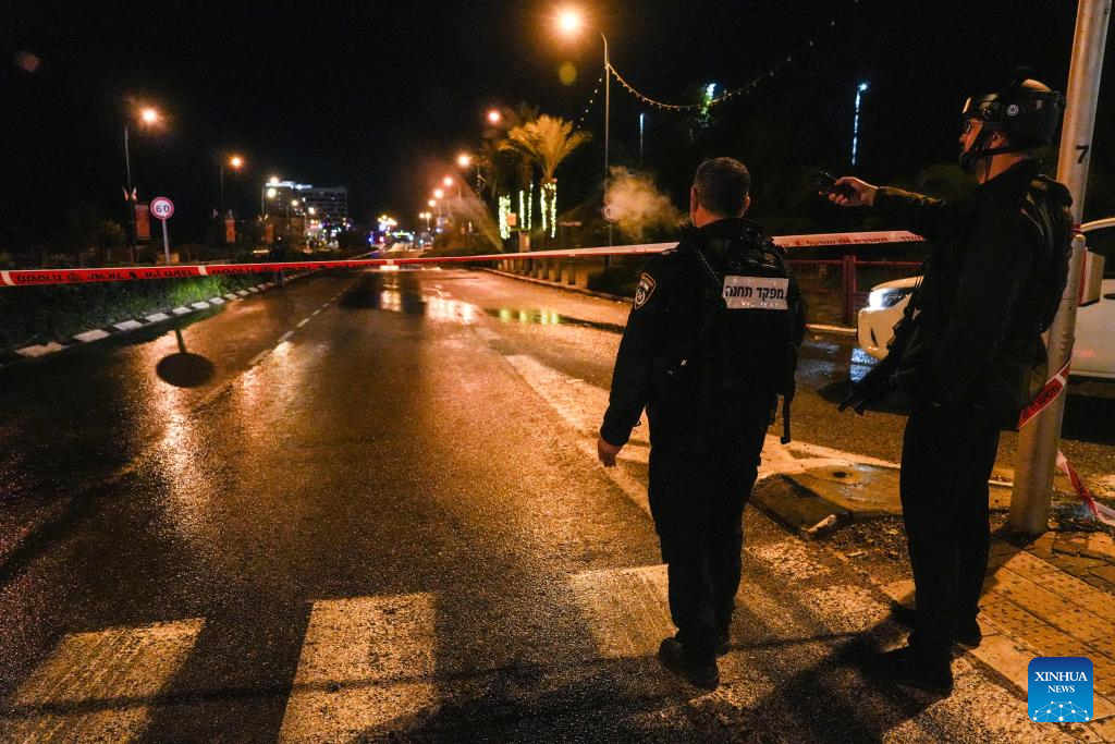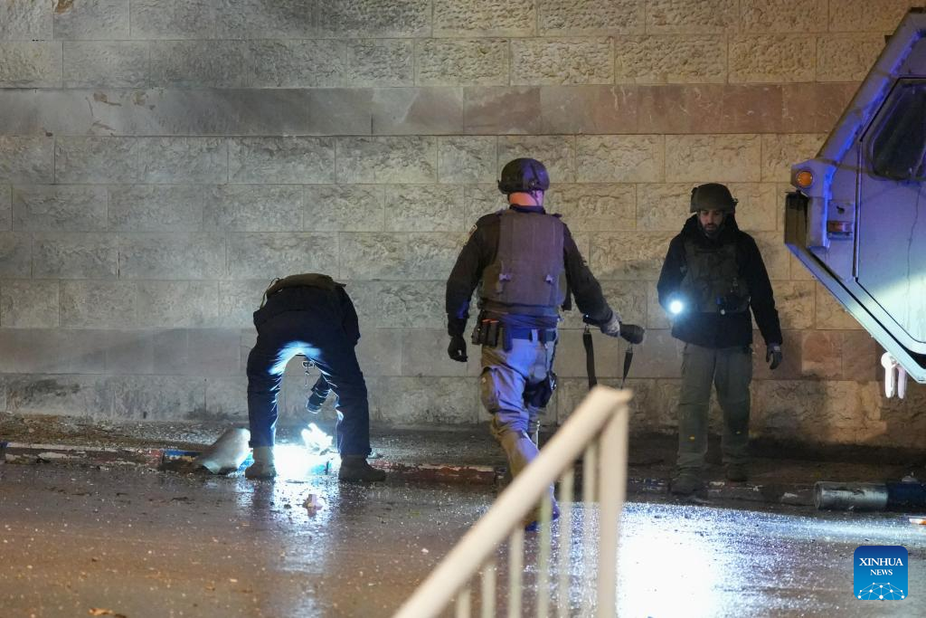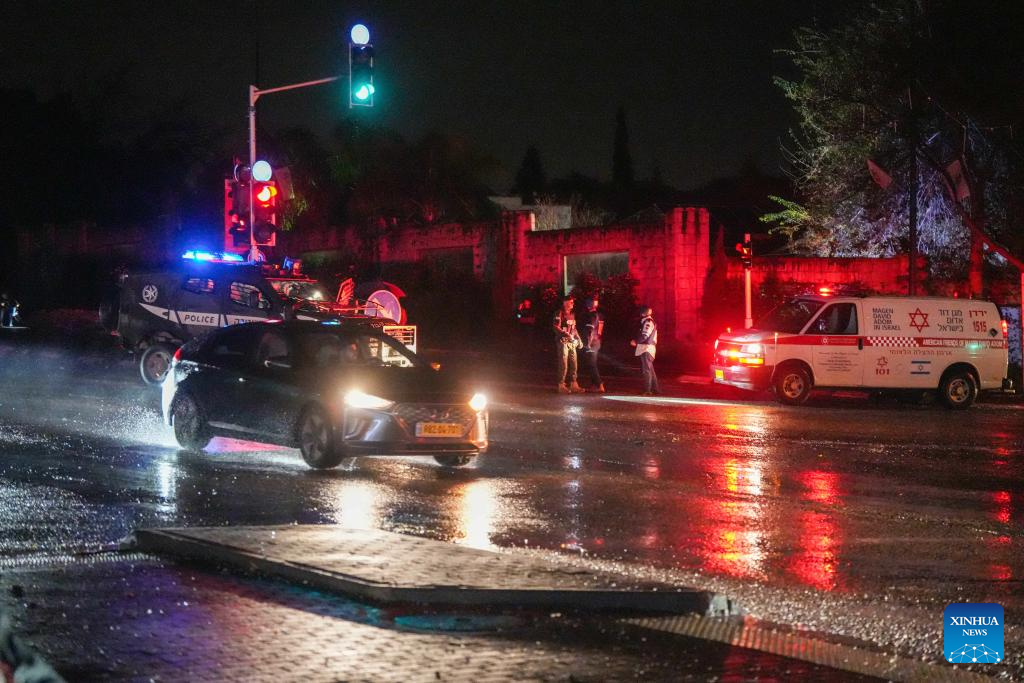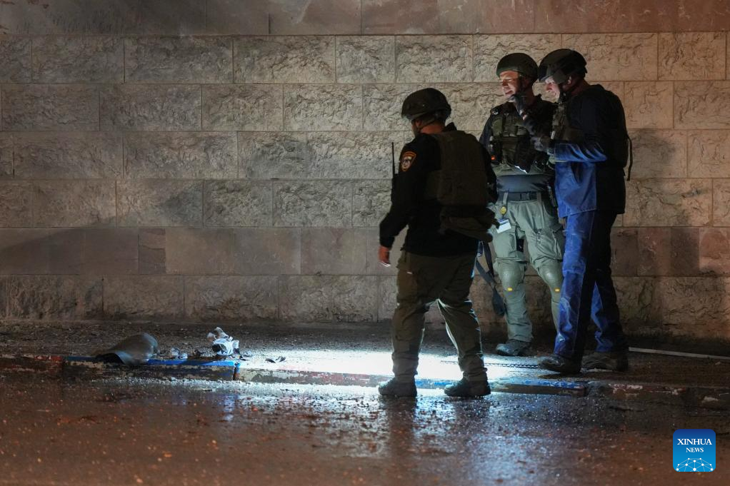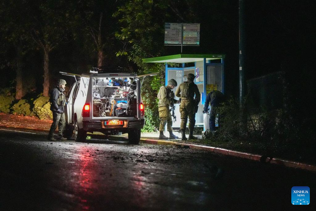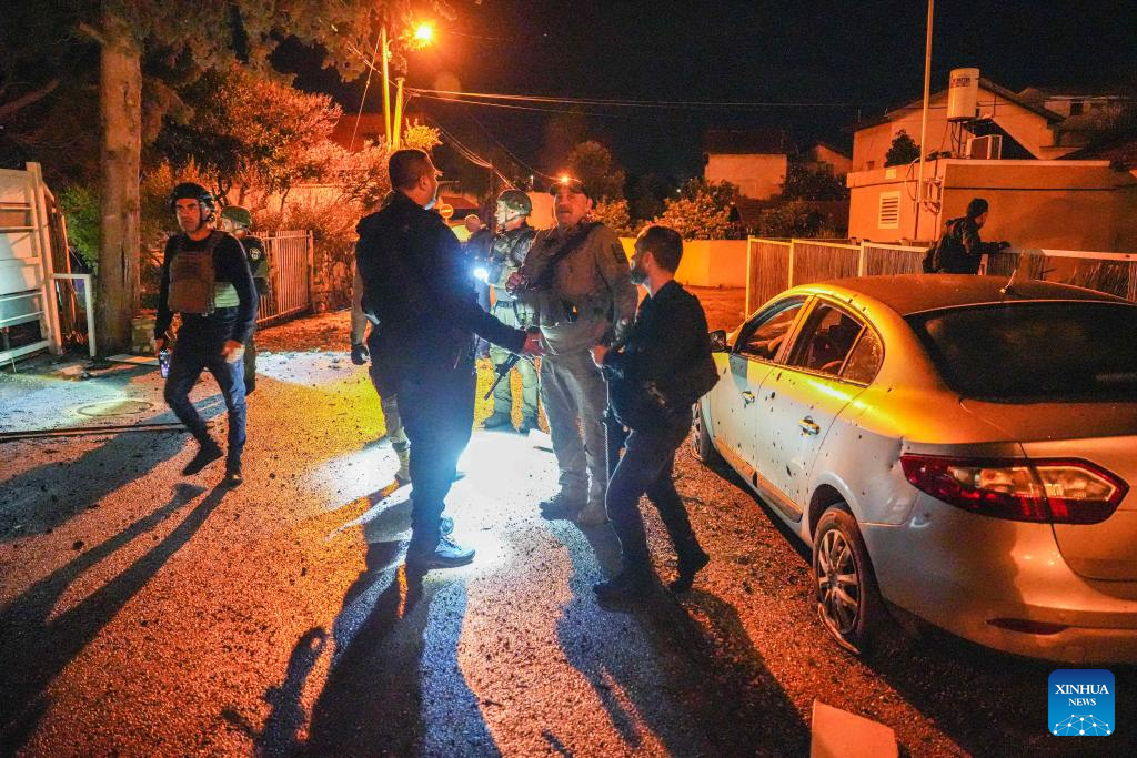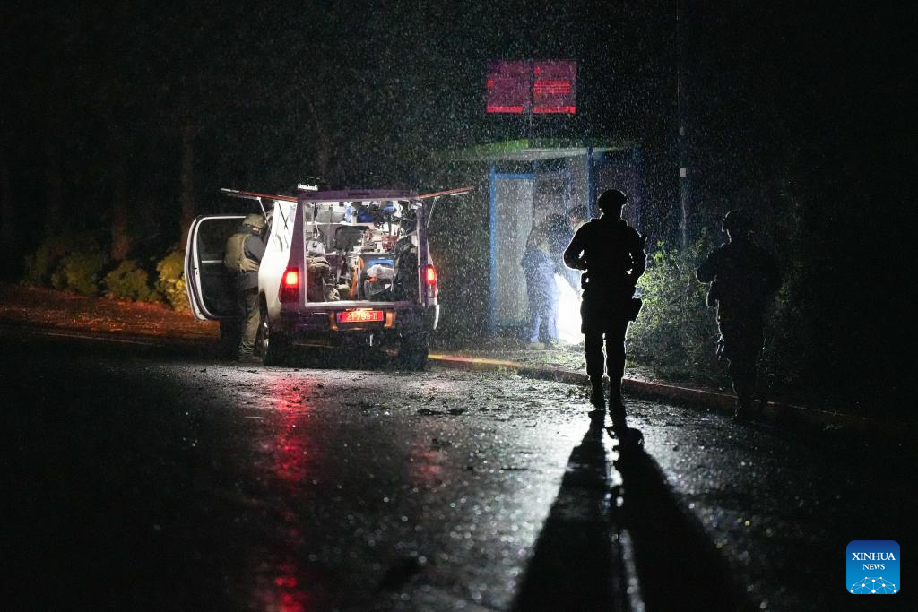 Israeli security forces work at the scene of a rocket attack from Lebanon in Kiryat Shmona, northern Israel, on Feb. 15, 2024. Hezbollah fired on Thursday evening dozens of rockets on Kiryat Shmona, a city in northern Israel, to retaliate Israel's deadly attacks on Lebanon's southern city of Nabatieh, the Lebanese armed group said in a statement. (Ayal Margolin/JINI via Xinhua)