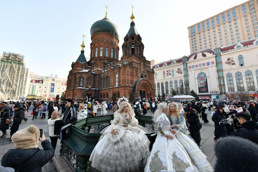 Tourists wearing costumes pose for photos at an art square in Harbin, northeast China's Heilongjiang Province, Feb. 12, 2024. (Xinhua/Wang Jianwei)
