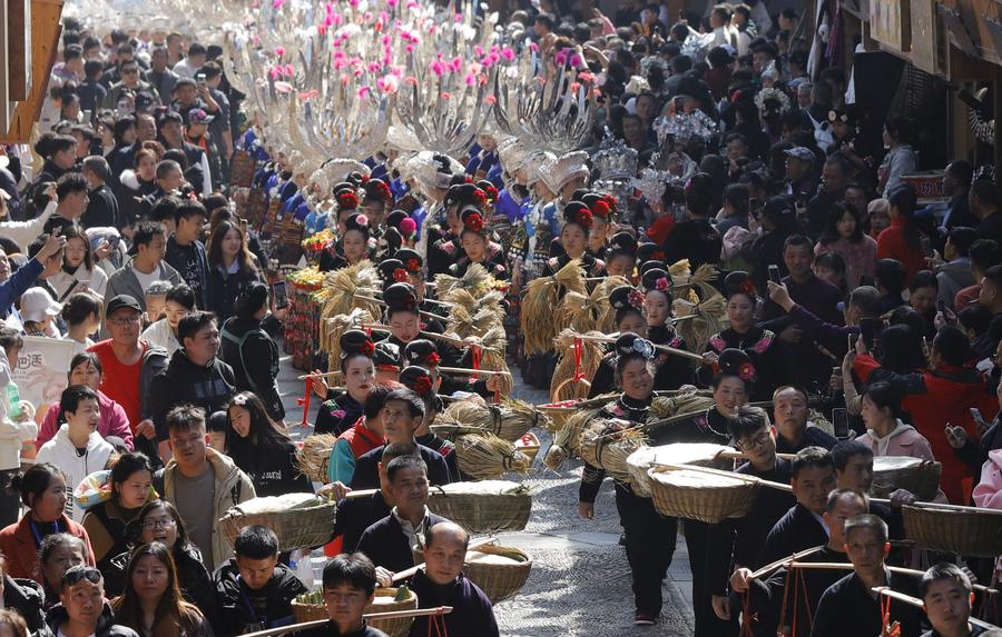 Tourists watch a parade at Xijiang Qianhu Miao Village in Leishan County of Qiandongnan Miao and Dong Autonomous Prefecture, southwest China's Guizhou Province, Feb. 13, 2024. (Photo by Wu Jibin/Xinhua)