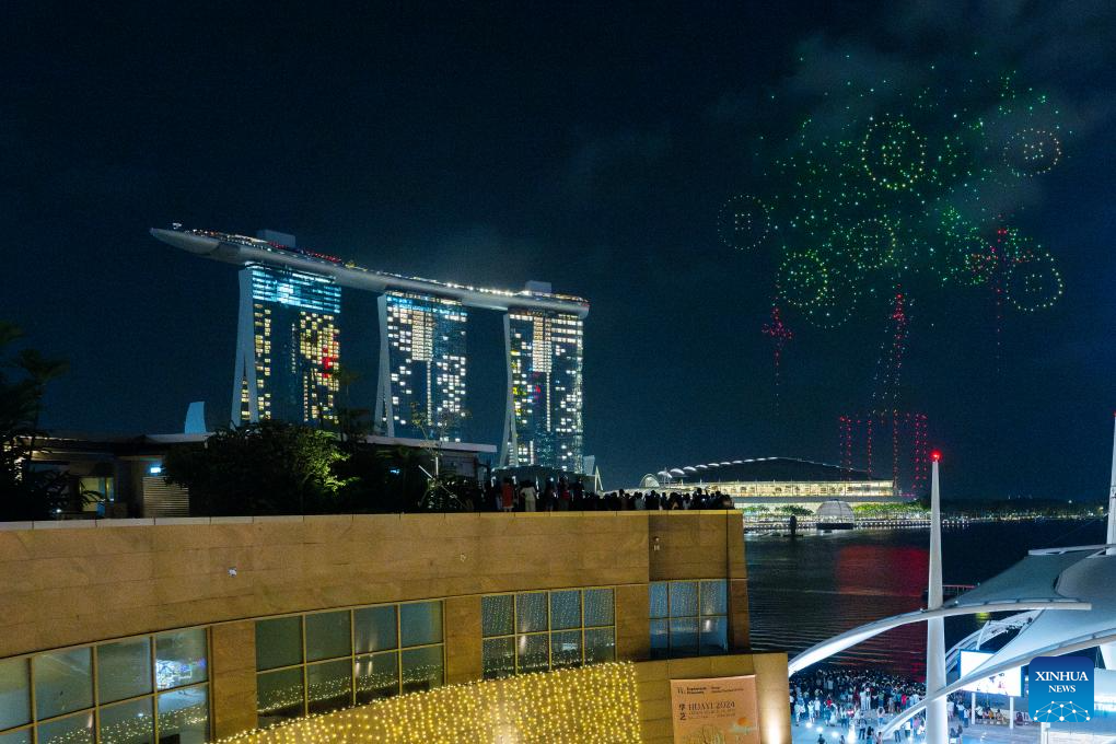 People watch a drone fleet performance celebrating the Year of the Dragon at Singapore's Marina Bay on Feb. 15, 2024. (Photo by Then Chih Wey/Xinhua)