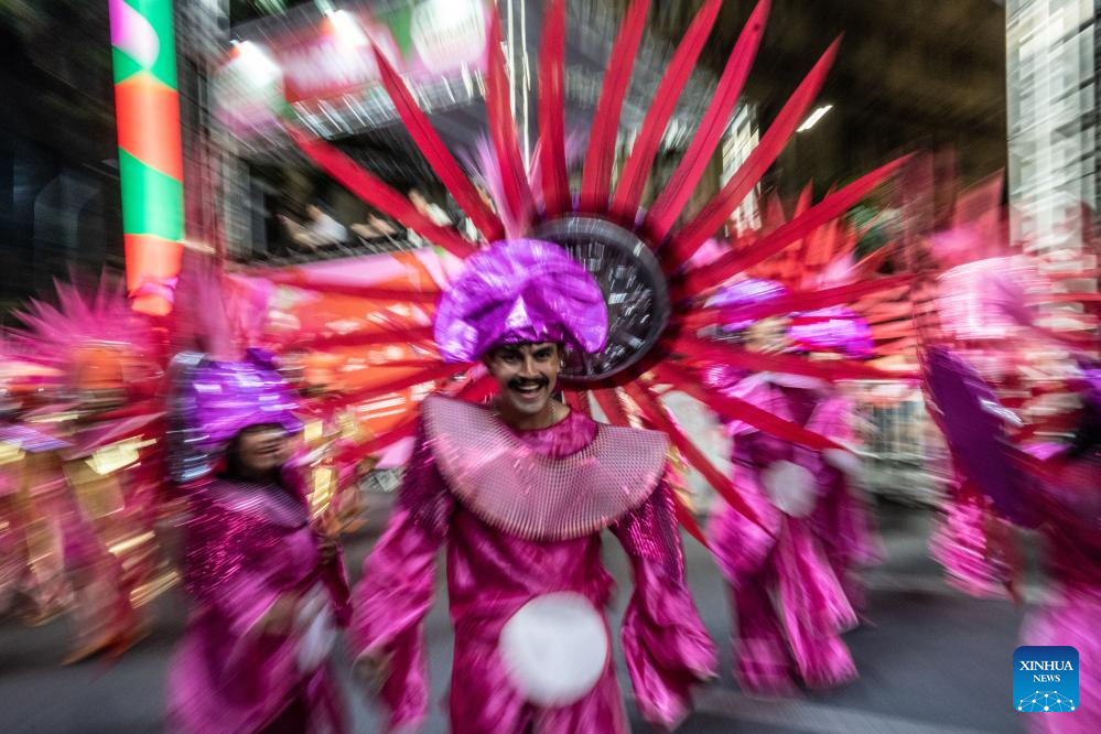 Members of Cidade Jardim Samba School participate in a carnival in Belo Horizonte, Brazil, Feb. 14, 2024. The school members staged performances at the event to celebrate the 50th anniversary of the establishment of diplomatic relations between China and Brazil and the Chinese Lunar New Year. (Xinhua/Wang Tiancong)