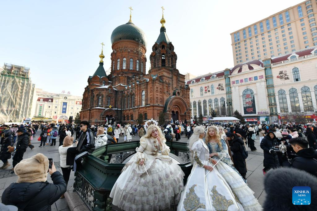 Tourists wearing costumes pose for photos at an art square in Harbin, northeast China's Heilongjiang Province, Feb. 12, 2024. More Chinese people nowadays choose to go on a journey during the Spring Festival to experience different cultures and lunar new year atmosphere. (Xinhua/Wang Jianwei)