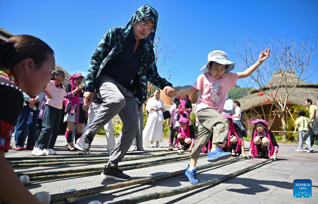 Tourists experience bamboo pole dance at Maona Village, Wuzhishan City of south China's Hainan Province, Feb. 14, 2024. More Chinese people nowadays choose to go on a journey during the Spring Festival to experience different cultures and lunar new year atmosphere. (Xinhua/Guo Cheng)