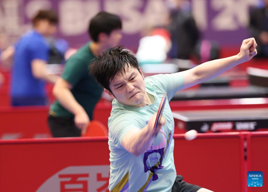 Team China's player Fan Zhendong attends a training session ahead of the ITTF World Team Table Tennis Championships Finals 2024 in Busan, South Korea, Feb. 15, 2024. The event will be staged here from Feb. 16 to 25. (Xinhua/Yao Qilin)