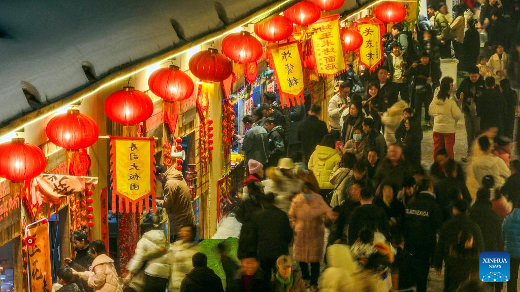 An aerial drone photo taken on Feb. 13, 2024 shows tourists purchasing snacks at a scenic area in Zunhua City, north China's Hebei Province. People across the country immersed themselves in the festive atmosphere of the Chinese New Year by enjoying traditional food and local snacks. (Photo by Liu Mancang/Xinhua)
