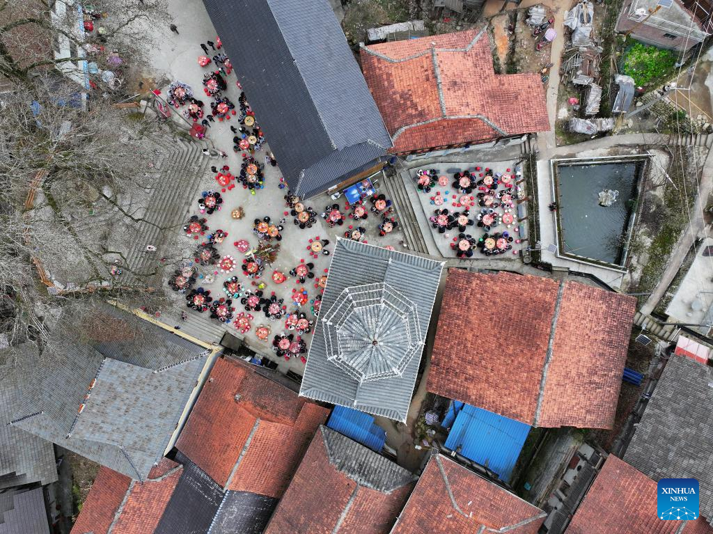 An aerial drone photo taken on Feb. 14, 2024 shows people of Miao ethnic group attending an open-air banquet during an event celebrating the Spring Festival in Gandong Township, Rongshui Miao Autonomous County, south China's Guangxi Zhuang Autonomous Region. People across China are enjoying the ongoing Spring Festival holiday in various ways. (Photo by Zheng Changhao/Xinhua)