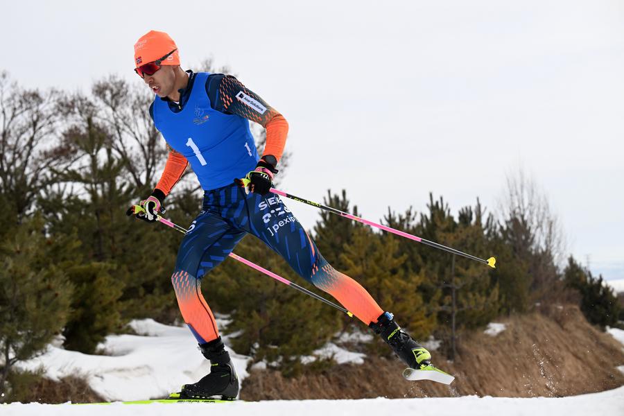 Wang Qiang of Chongqing competes during the cross-country skiing men's 15km+15km skiathlon of the China's 14th National Winter Games in Ulanqab, north China's Inner Mongolia Autonomous Region, Feb. 14, 2024. (Xinhua/Zhao Zishuo)
