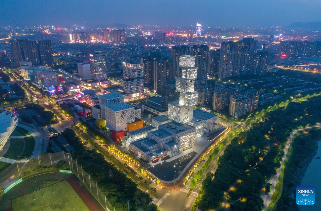 An aerial drone photo taken on Sept. 29, 2023 shows a night view of Jiangmen, south China's Guangdong Province. (Photo by Zhou Huadong/Xinhua)