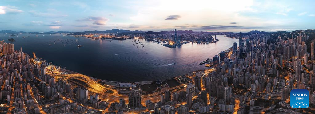 An aerial drone photo taken on Aug. 7, 2019 shows a view of the Victoria Harbour in Hong Kong, south China. (Photo by Qiu Huo/Xinhua)