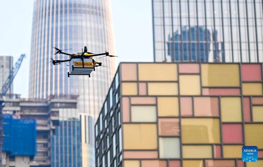 An unmanned aerial vehicle (UAV) carrying food package is seen at the Houhai area in Shenzhen, south China's Guangdong Province, Nov. 24, 2023. (Xinhua/Mao Siqian)?