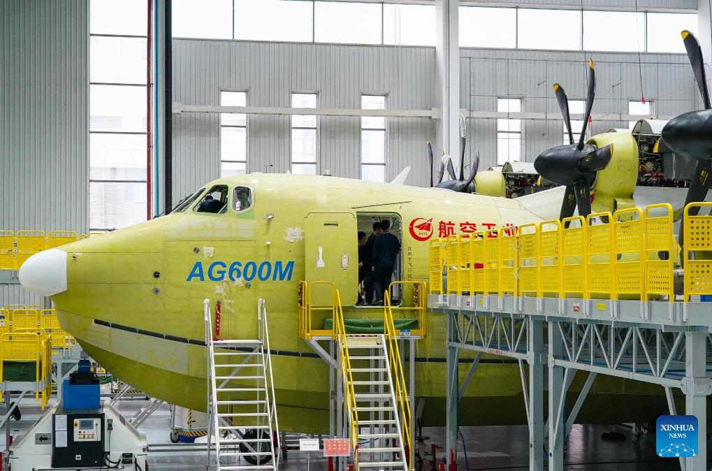 An AG600M large amphibious aircraft is produced at the final assembly line facility in Zhuhai, south China's Guangdong Province, Nov. 7, 2022. (Xinhua/Liu Dawei)