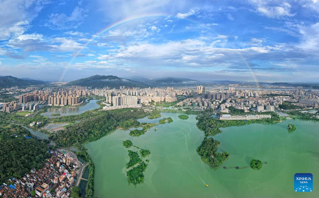 An aerial drone photo taken on Sept. 17, 2023 shows a rainbow over the city of Zhaoqing, south China's Guangdong Province. (Photo by Liu Chunlin/Xinhua)