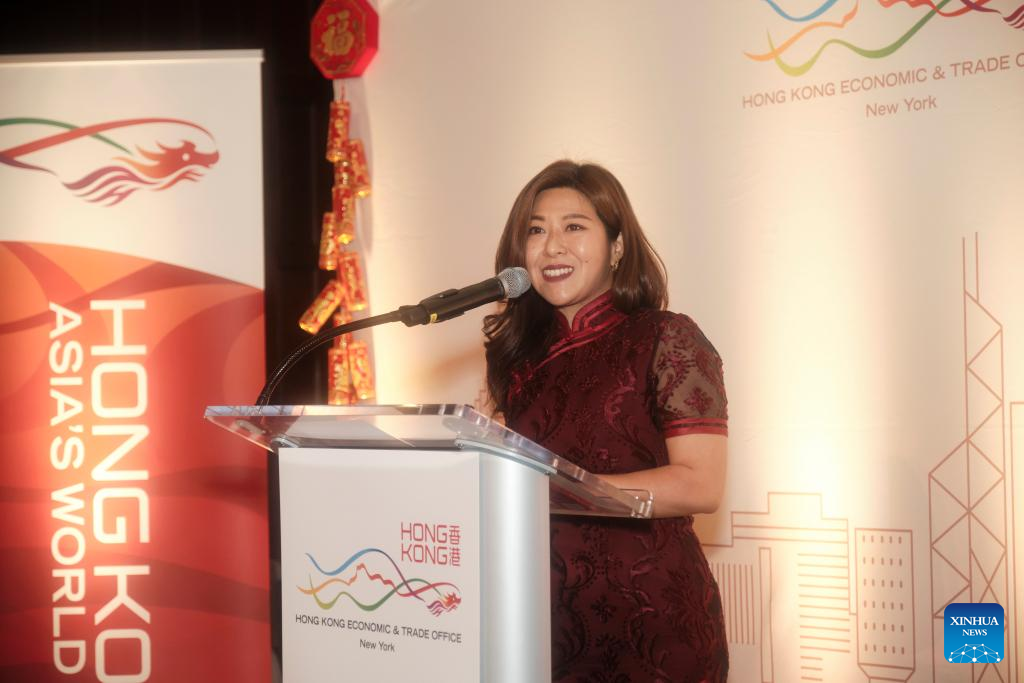 Maisie Ho, director of the Hong Kong Economic and Trade Office in New York (HKETONY), speaks at HKETONY's spring reception to celebrate the Year of the Dragon in New York, the United States, Feb. 15, 2024.(HKETONY/Handout via Xinhua)