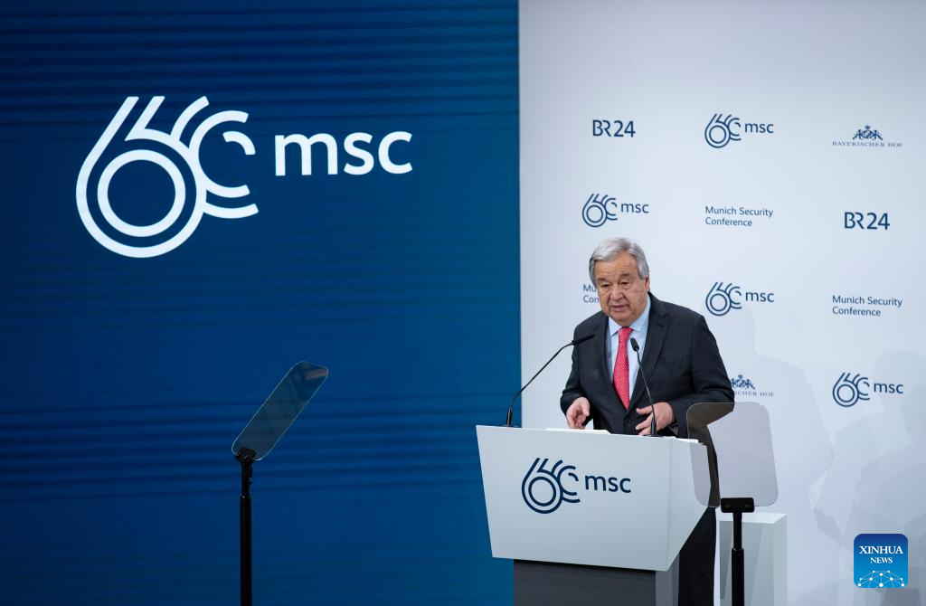 United Nations Secretary-General Antonio Guterres speaks during the opening of the 60th Munich Security Conference (MSC) in Munich, Germany, Feb. 16, 2024. The 60th MSC opened here on Friday, with a spotlight on the need to boost cooperation and improve global governance. (Xinhua/Zhang Fan)