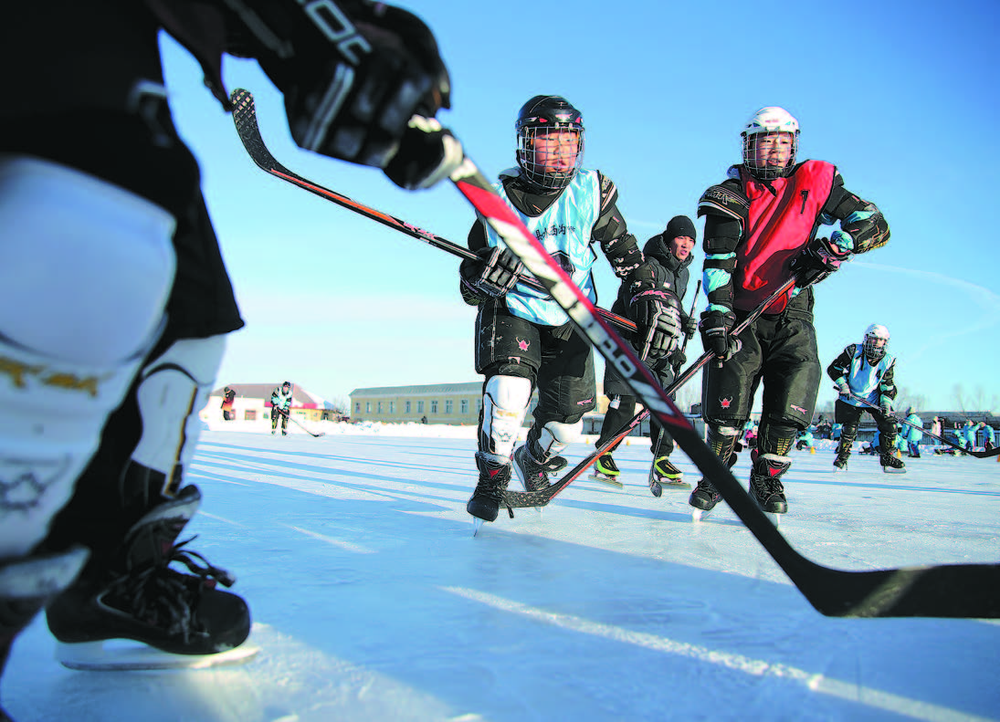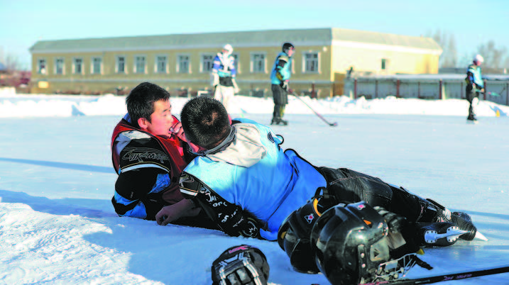Shuixigou Middle School hockey team members take a break from training on Dec 20, 2023. WANG JING/CHINA DAILY