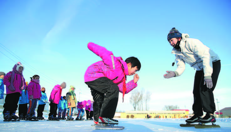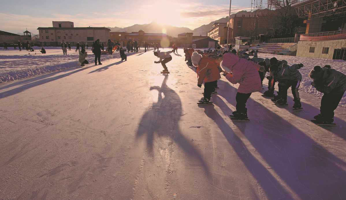 A teacher teaches students speed skating at Shuixigou Middle School on Dec 20,2023. WANG JING/CHINA DAILY