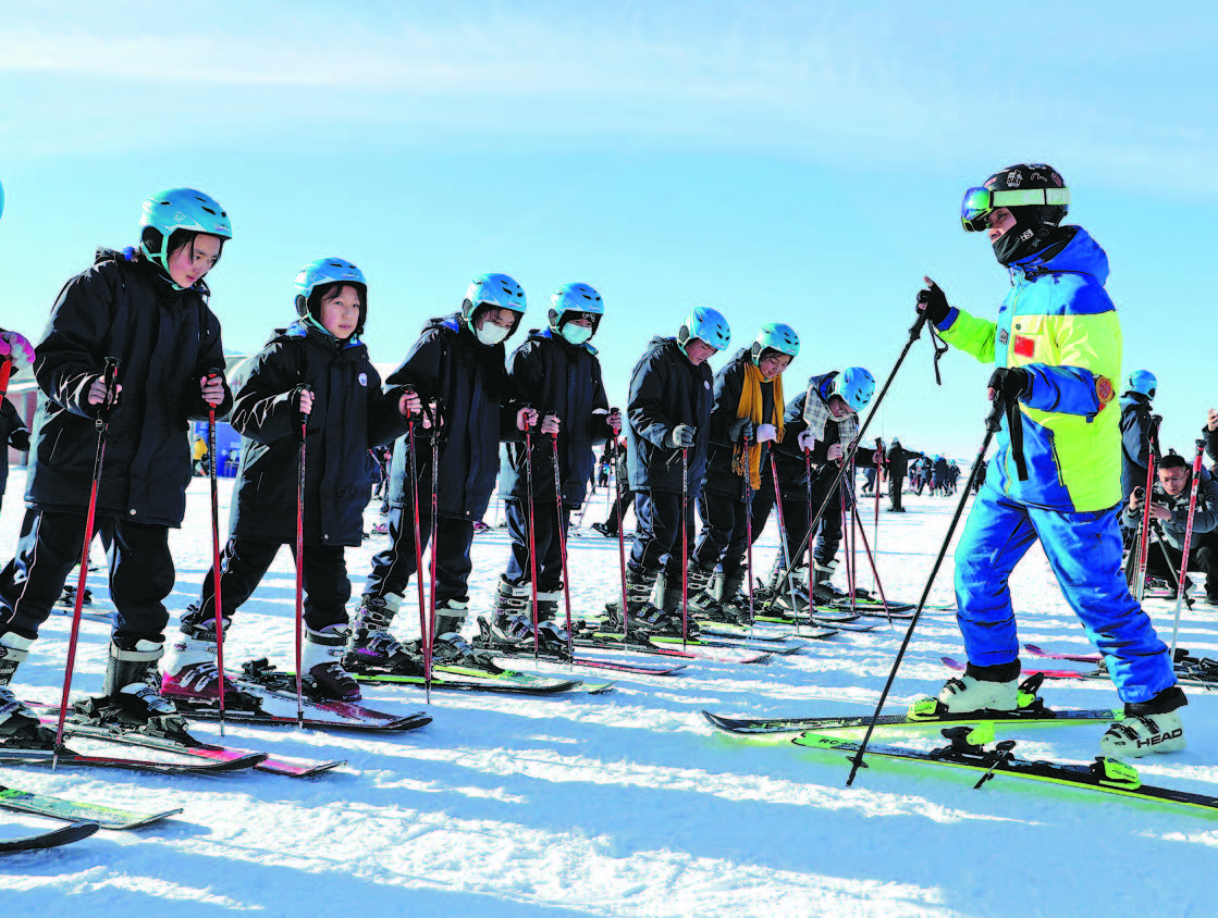 Students from Miaoergou Middle School of Urumqi county take a skiing lesson at the Silkroad Mountain Resort in Urumqi county, Northwest China's Xinjiang Uygur Autonomous region on Dec 19, 2023. WANG JING/CHINA DAILY