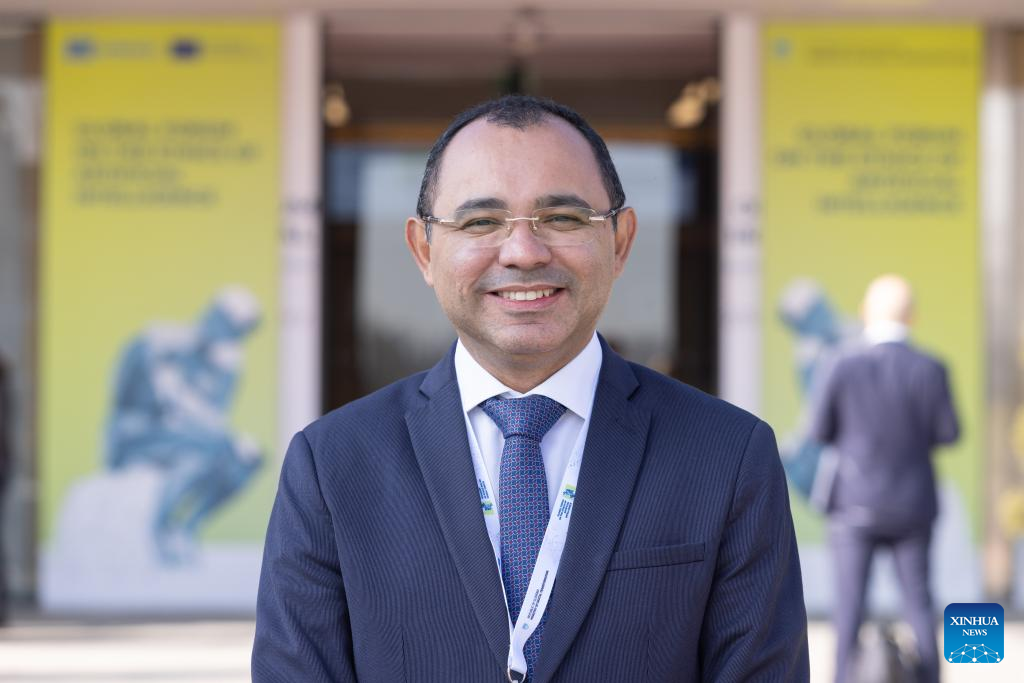 Edson Prestes, an informatics professor at Brazil's Federal University of Rio Grande do Sul, speaks during an interview with Xinhua on the sidelines of the UNESCO Global Forum on the Ethics of AI in Ljubljana, Slovenia, Feb. 5, 2024. China has set an "example" in the regulation of artificial intelligence (AI), an informatics professor at Brazil's Federal University of Rio Grande do Sul has said.(Photo by Zeljko Stevanic/Xinhua)