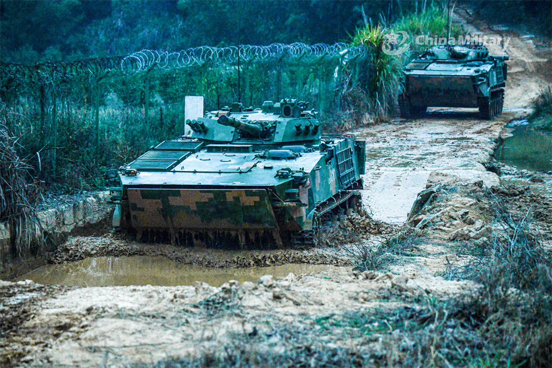 Armored vehicles attached to a brigade with the army under the PLA Eastern Theater Command rumble on the muddy road during driving training on February 5, 2024. (eng.chinamil.com.cn/Photo by Liu Zhiyong)