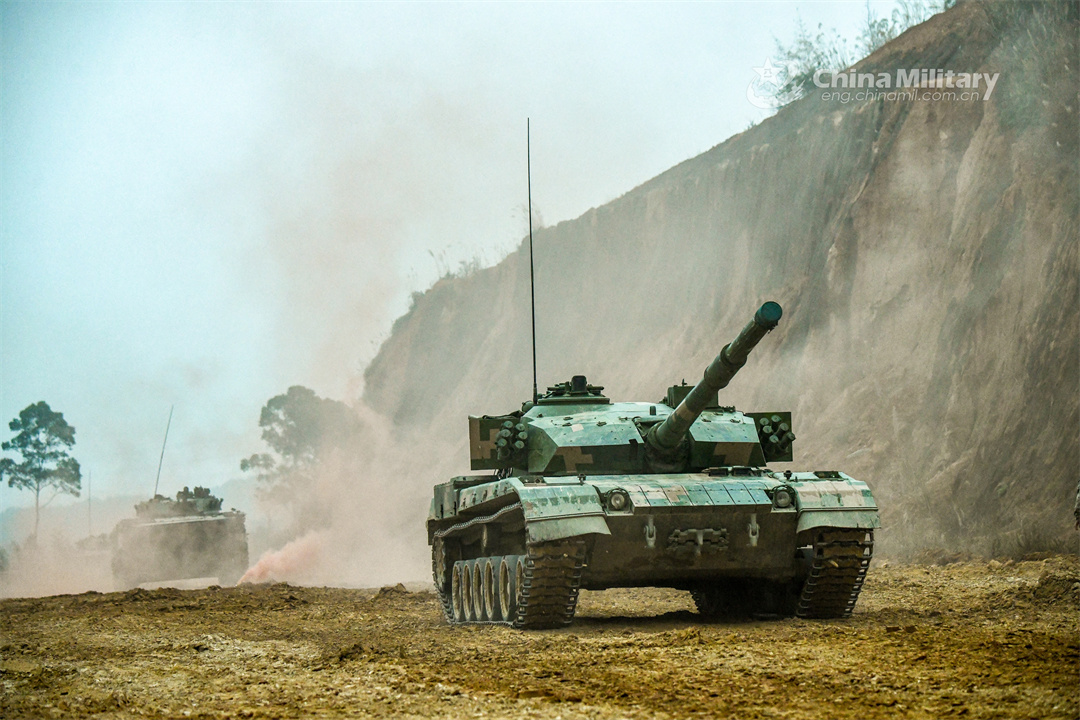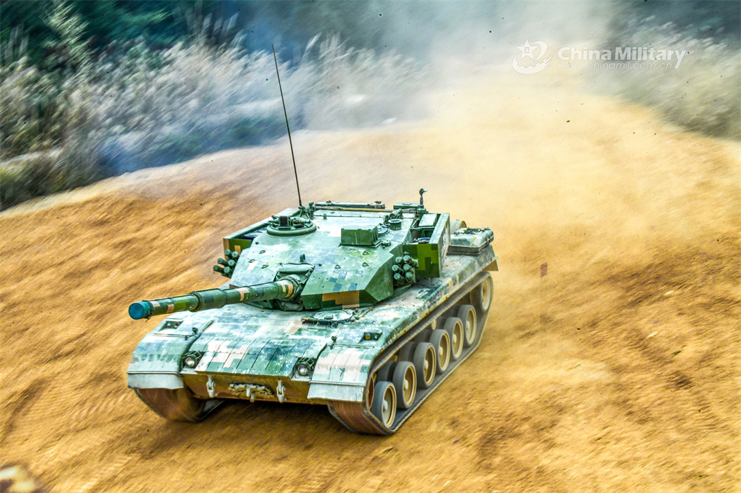 A main battle tank (MBT) attached to a brigade with the army under the PLA Eastern Theater Command rumbles on the field during driving training on February 5, 2024. (eng.chinamil.com.cn/Photo by Liu Zhiyong)