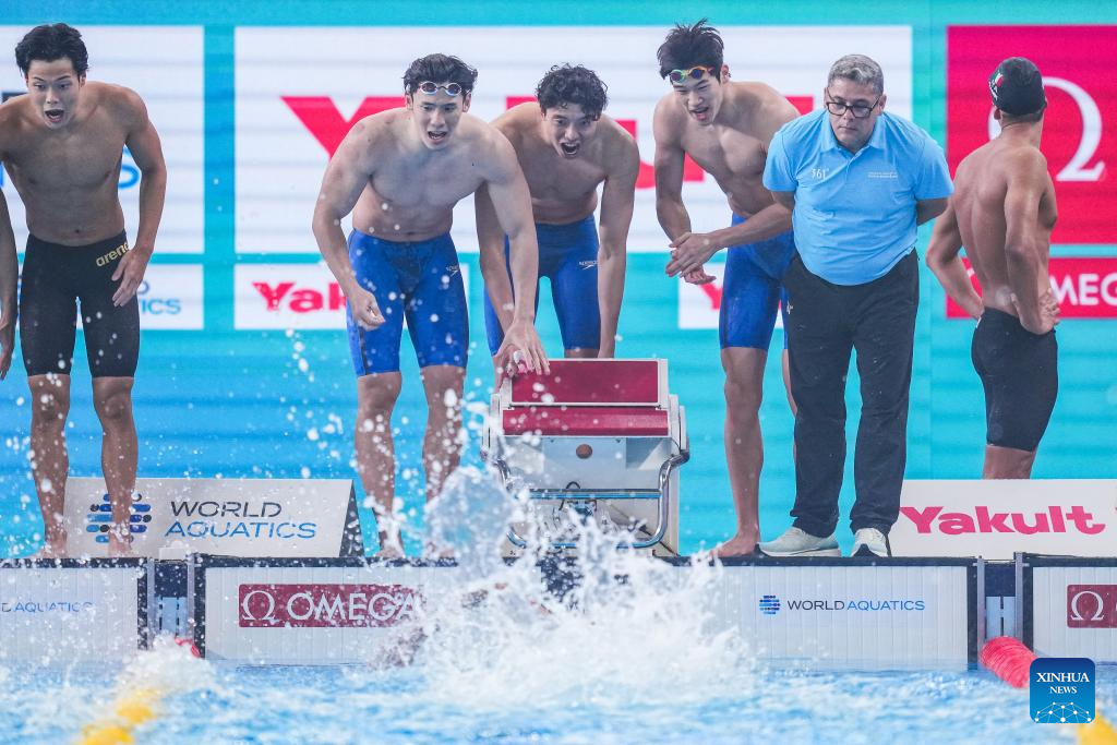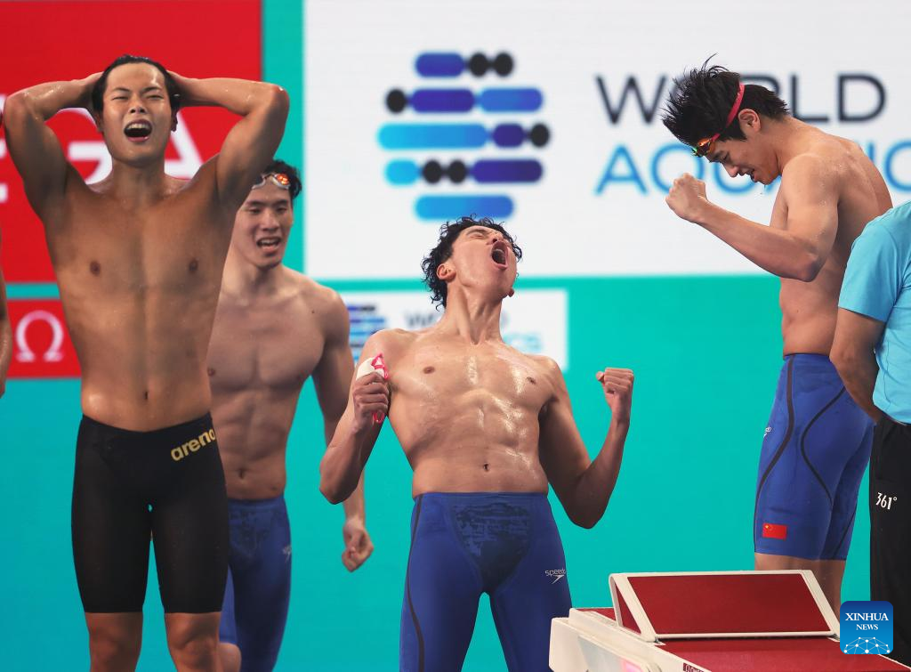 In the men's 4x200m freestyle relay held Friday evening, the Chinese team composed of Ji Xinjie, Wang Haoyu, Pan Zhanle and Zhang Zhanshuo clinched gold with a time of 7 minutes and 1.84 seconds. This triumph followed China's win in the women's 4x200m freestyle relay on Thursday.