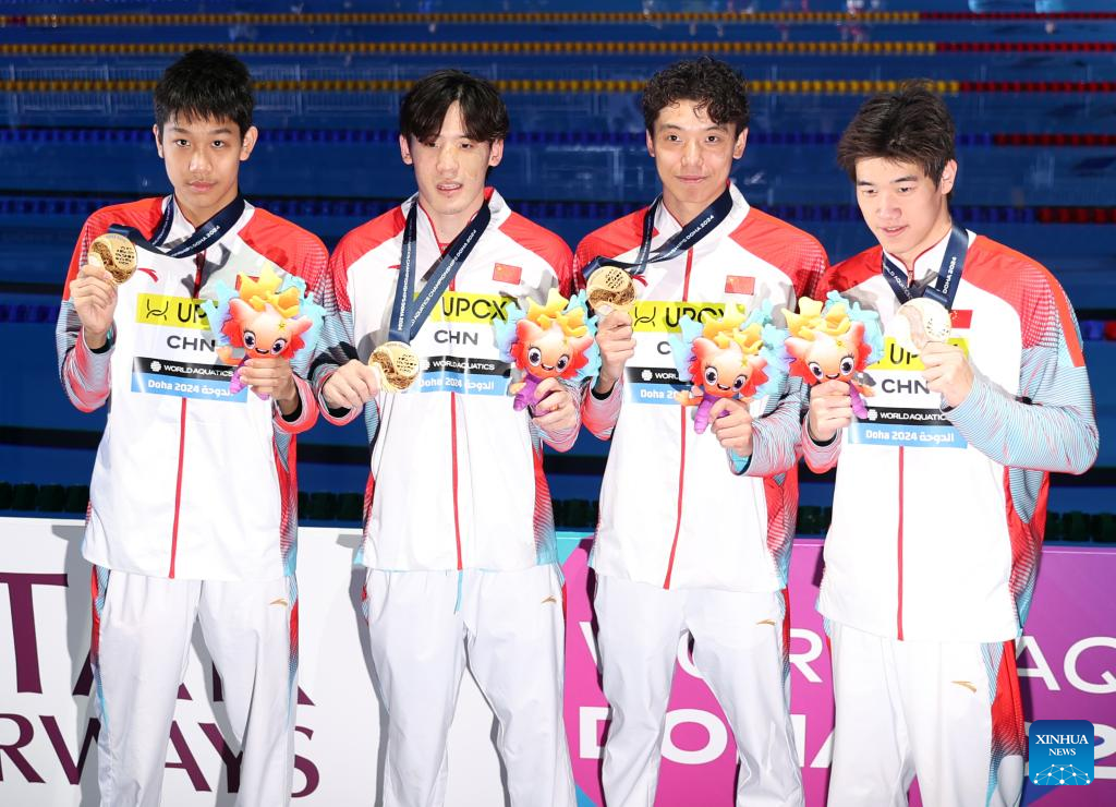 (L to R)Gold medalists Zhang Zhanshuo, Wang Haoyu, Ji Xinjie and Pan Zhanle of China pose after the awarding ceremony for the men's 4X200m freestyle relay of swimming event at the World Aquatics Championships 2024 in Doha, Qatar, Feb. 16, 2024. (Xinhua/Luo Yuan)