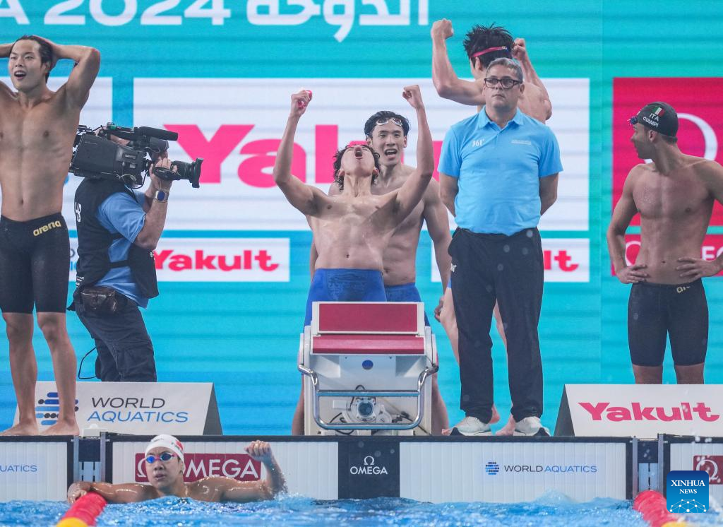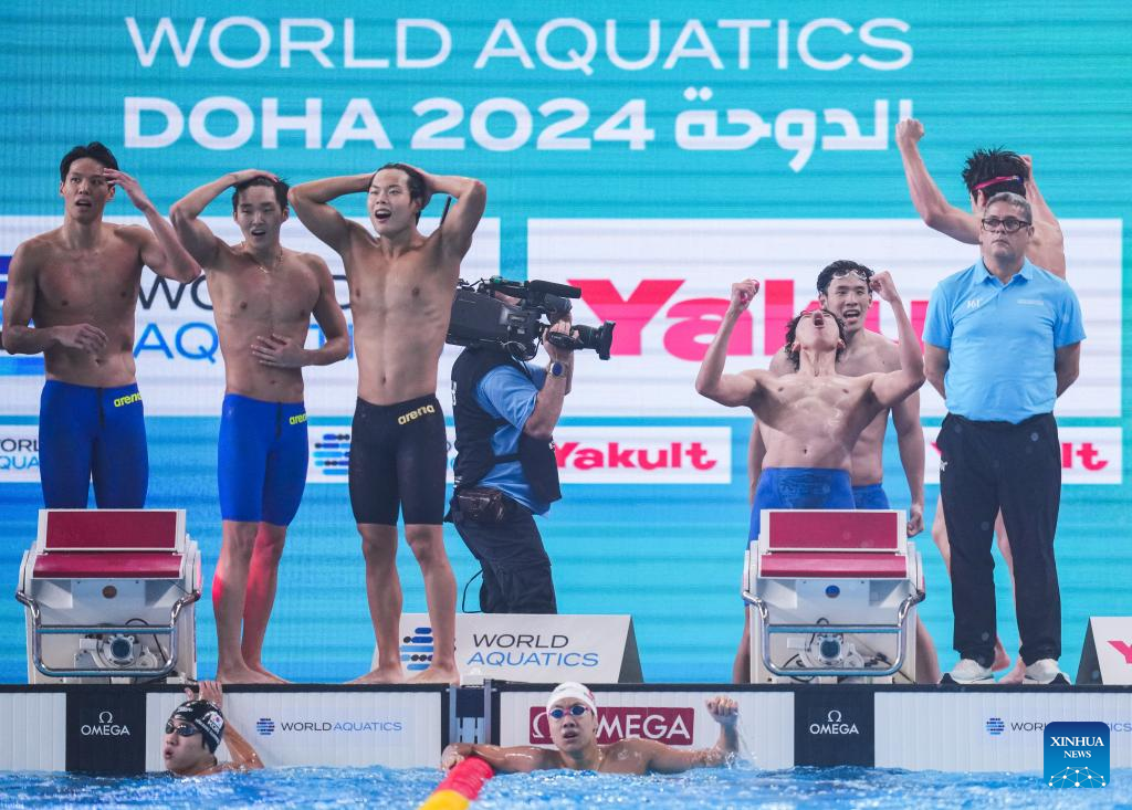 Ji Xinjie (3rd L), Pan Zhanle (4th L) and Wang Haoyu (2nd L) of China celebrate after winning the men's 4X200m freestyle relay final of swimming event at the World Aquatics Championships 2024 in Doha, Qatar, Feb. 16, 2024. (Xinhua/Luo Yuan)