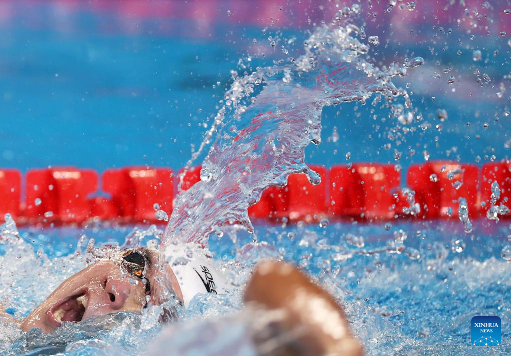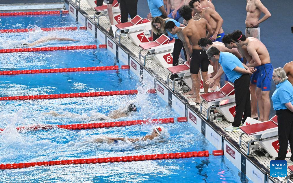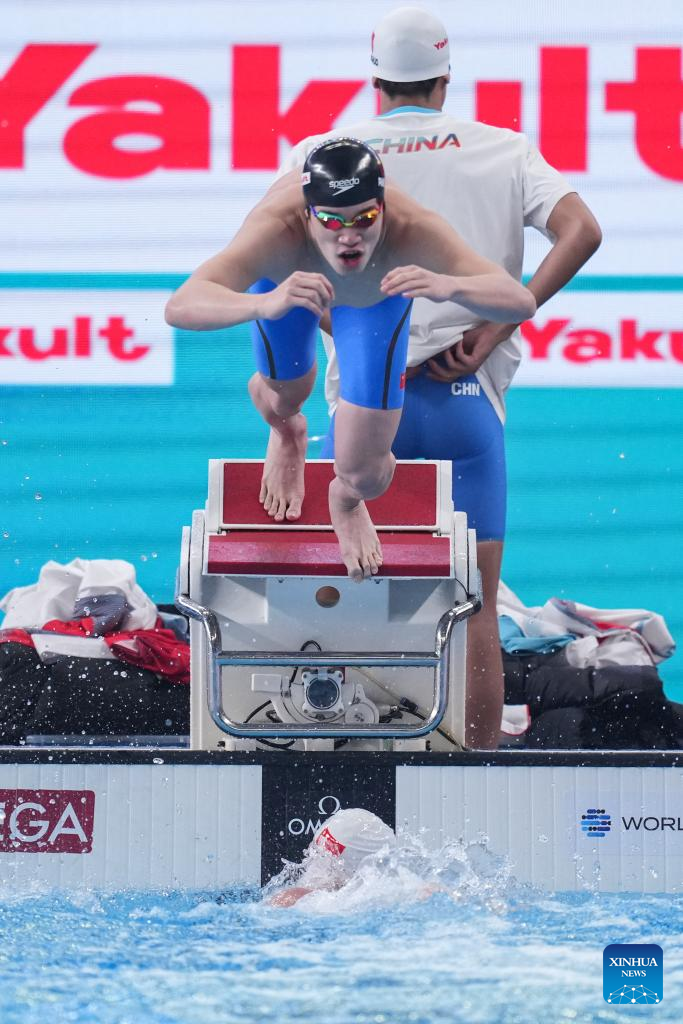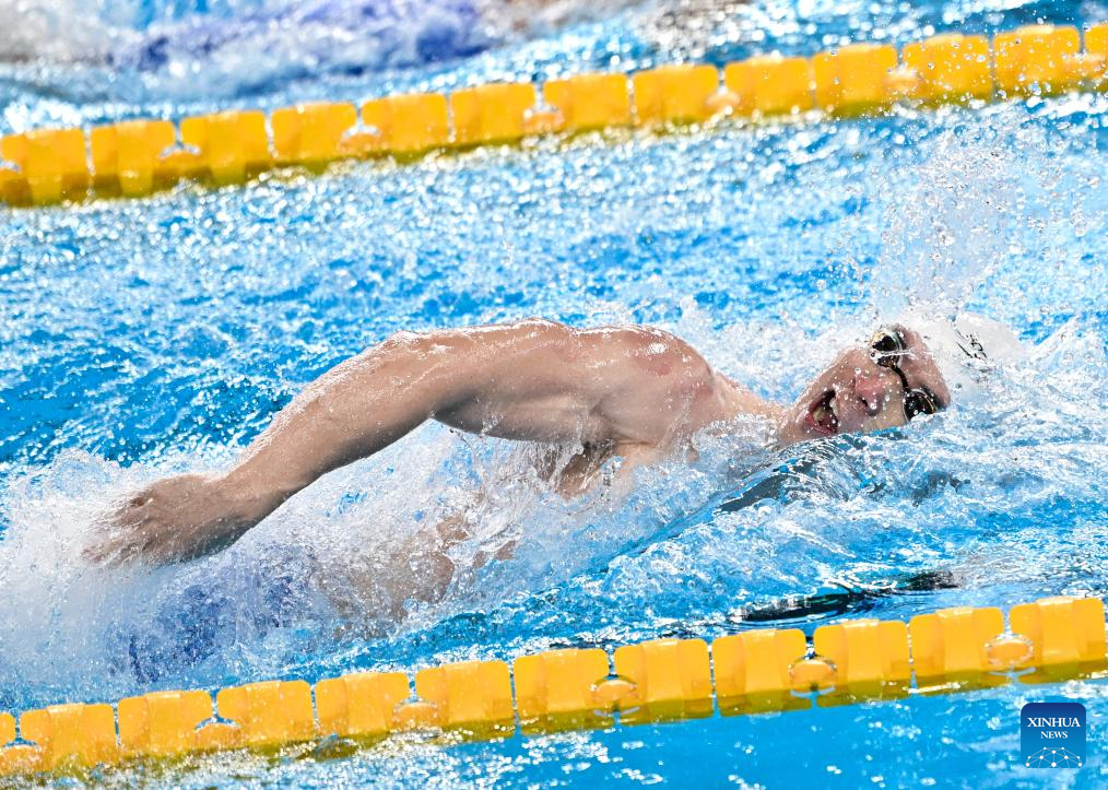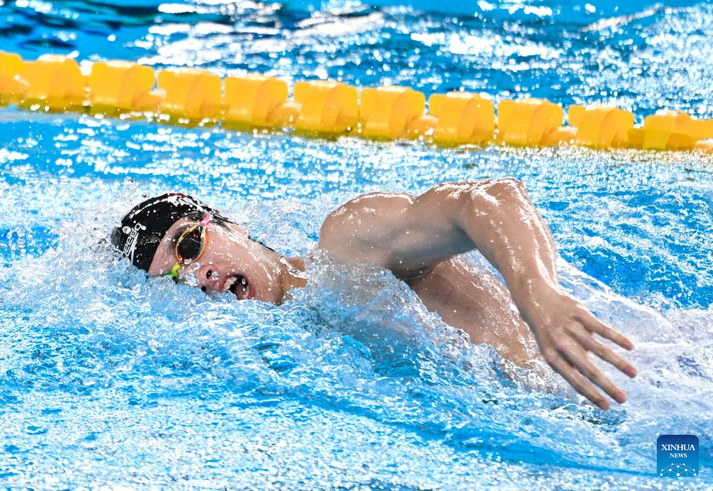 Pan Zhanle of China competes during the men's 4X200m freestyle relay final of swimming event at the World Aquatics Championships 2024 in Doha, Qatar, Feb. 16, 2024. (Xinhua/Du Yu)