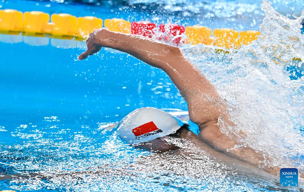 Pan Zhanle of China competes during the men's 4X200m freestyle relay final of swimming event at the World Aquatics Championships 2024 in Doha, Qatar, Feb. 16, 2024. (Xinhua/Xia Yifang)