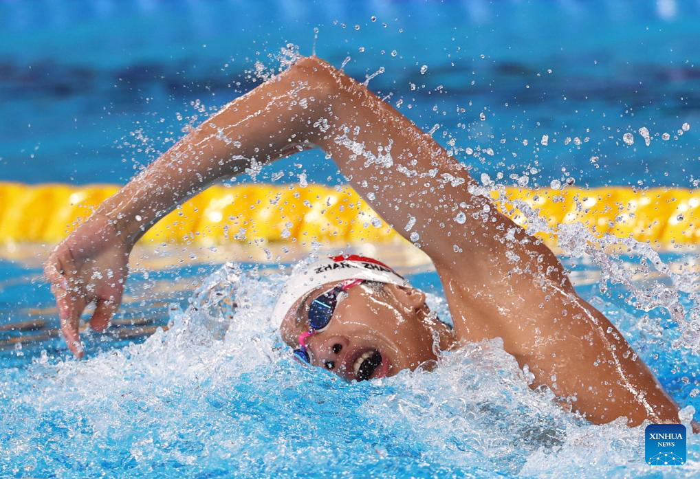 Zhang Zhanshuo of China competes during the men's 4X200m freestyle relay final of swimming event at the World Aquatics Championships 2024 in Doha, Qatar, Feb. 16, 2024. (Xinhua/Luo Yuan)