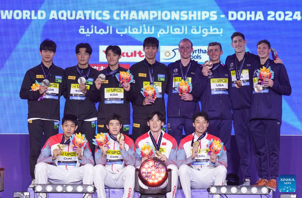 Gold medalists team China (bottom), silver medalists team South Korea (L) and bronze medalists team USA pose during the awarding ceremony for the men's 4X200m freestyle relay of swimming event at the World Aquatics Championships 2024 in Doha, Qatar, Feb. 16, 2024. (Xinhua/Du Yu)