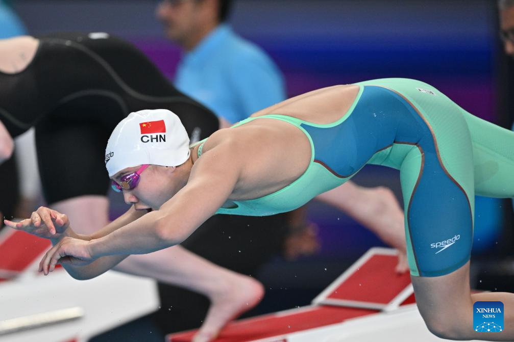 Pan Zhanle of team China competes during the mixed 4X100m freestyle relay final of swimming event at the World Aquatics Championships 2024 in Doha, Qatar, Feb. 17, 2024. (Xinhua/Xia Yifang)