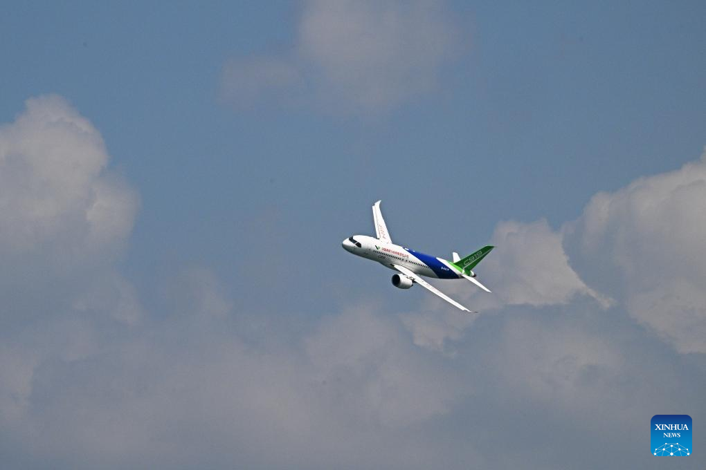 A Chinese passenger jet C919 makes a rehearsal flight to prepare for the upcoming Singapore Airshow in Singapore, Feb. 18, 2024. (Photo by Then Chih Wey/Xinhua)