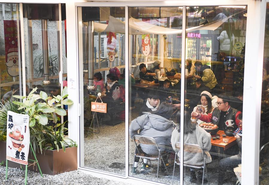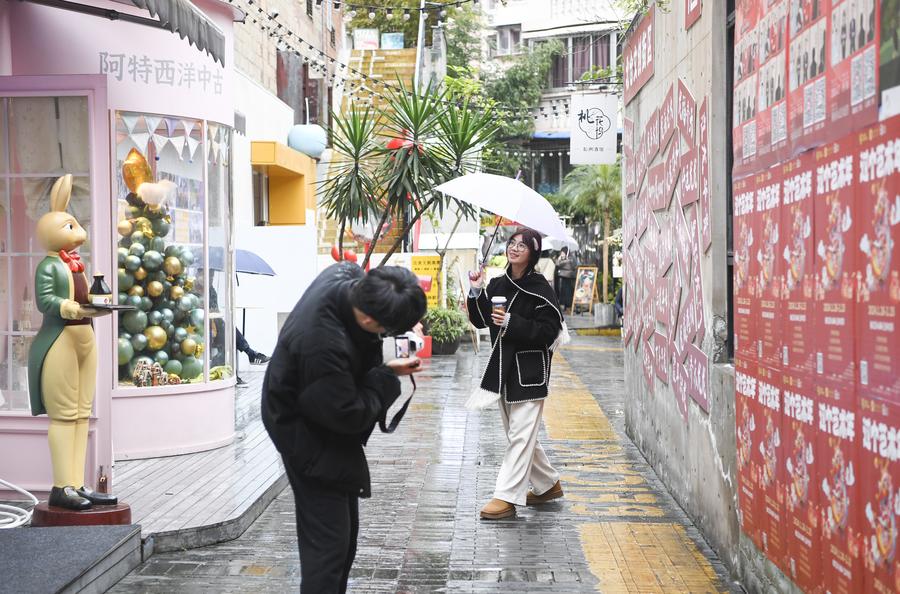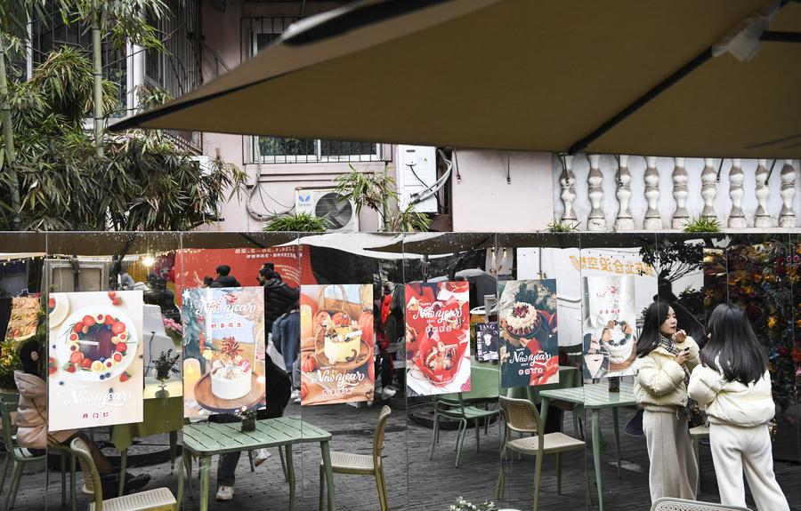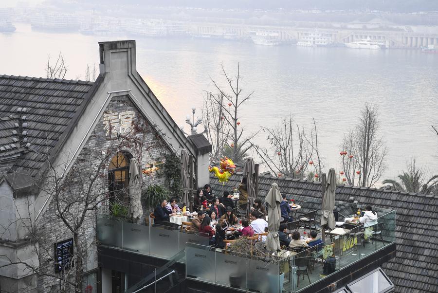 People enjoy themselves at the Beicang Cultural and Creative Block in Jiangbei District of southwest China's Chongqing Municipality, Feb. 15, 2024. (Xinhua/Wang Quanchao)