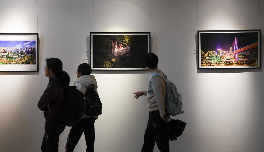 People visit a photography exhibition at the Beicang Cultural and Creative Block in Jiangbei District of southwest China's Chongqing Municipality, Feb. 15, 2024. (Xinhua/Wang Quanchao)