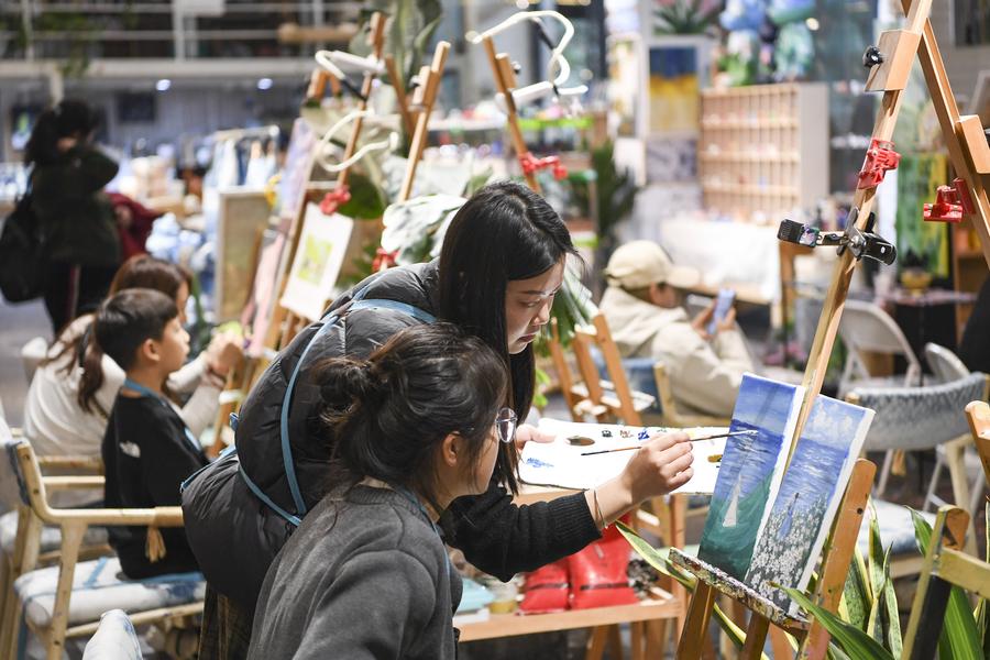 People enjoy painting at the Beicang Cultural and Creative Block in Jiangbei District of southwest China's Chongqing Municipality, Feb. 15, 2024. (Xinhua/Wang Quanchao)