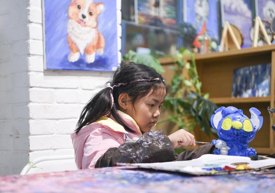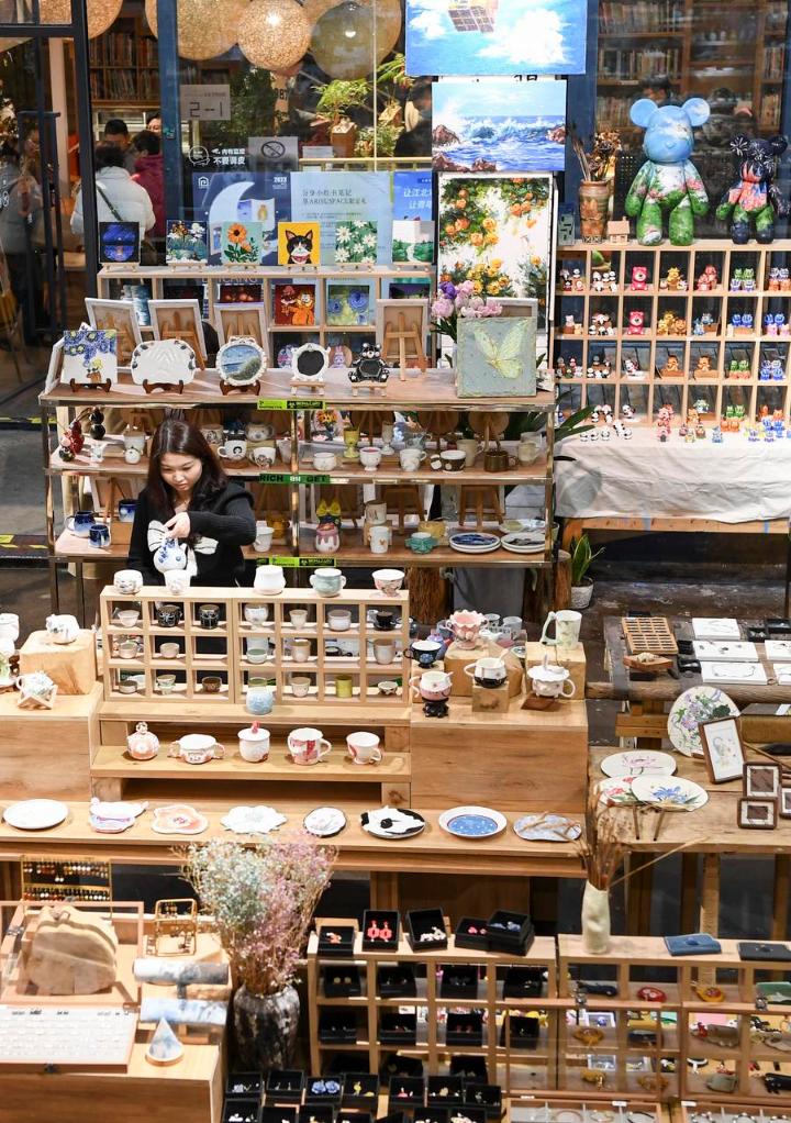 A girl does handwork at the Beicang Cultural and Creative Block in Jiangbei District of southwest China's Chongqing Municipality, Feb. 15, 2024. (Xinhua/Wang Quanchao)