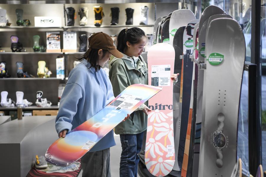 People shop for snowboards at a cultural industrial park in Liangjiang New Area, southwest China's Chongqing Municipality, Feb. 15, 2024. (Xinhua/Wang Quanchao)