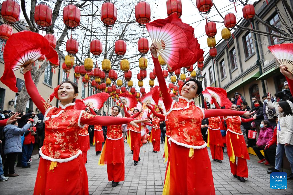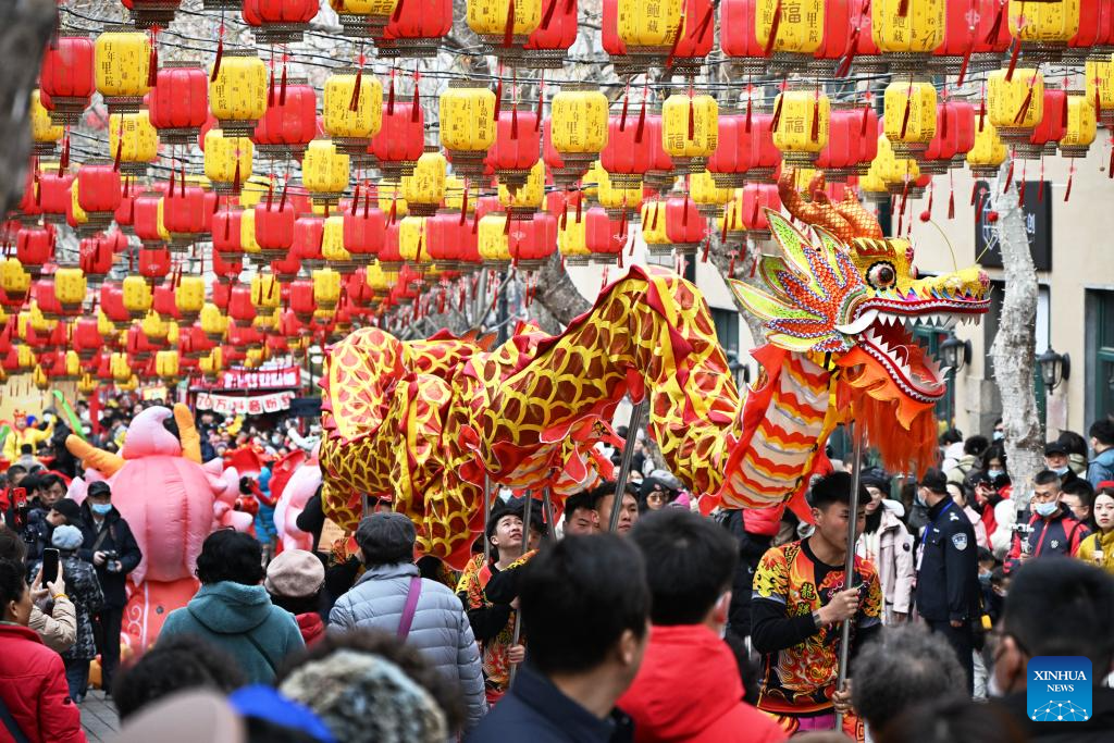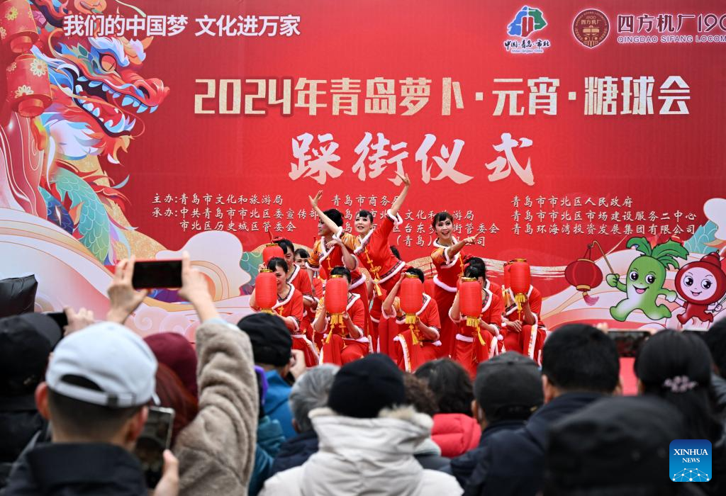People perform during a fair in celebration of the Chinese Lunar New Year in Qingdao, east China's Shandong Province, Feb. 18, 2024. The fair featuring lantern show, dragon dance and specialty food attracted many tourists here. (Xinhua/Li Ziheng)