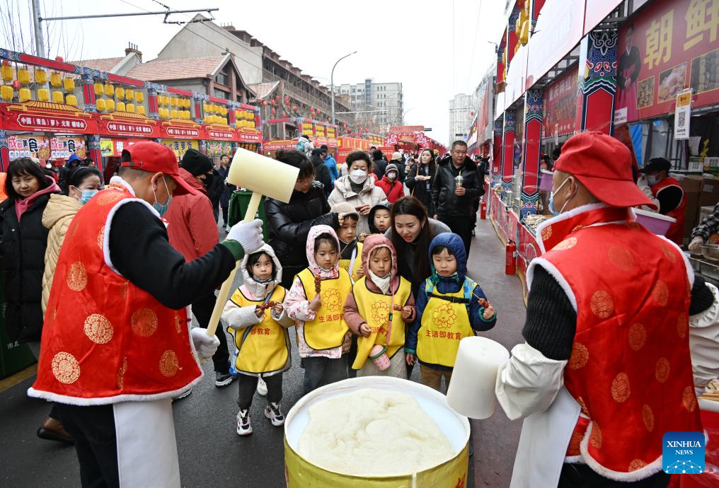 Staff members make ciba, a snack made of sticky rice, during a fair in celebration of the Chinese Lunar New Year in Qingdao, east China's Shandong Province, Feb. 18, 2024. The fair featuring lantern show, dragon dance and specialty food attracted many tourists here. (Xinhua/Li Ziheng)