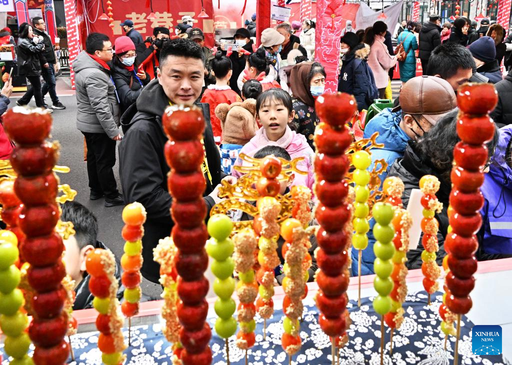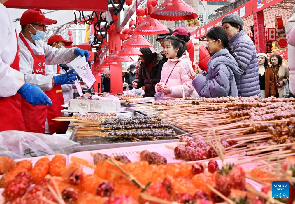 Tourists select candied fruits during a fair in celebration of the Chinese Lunar New Year in Qingdao, east China's Shandong Province, Feb. 18, 2024. The fair featuring lantern show, dragon dance and specialty food attracted many tourists here. (Xinhua/Li Ziheng)
