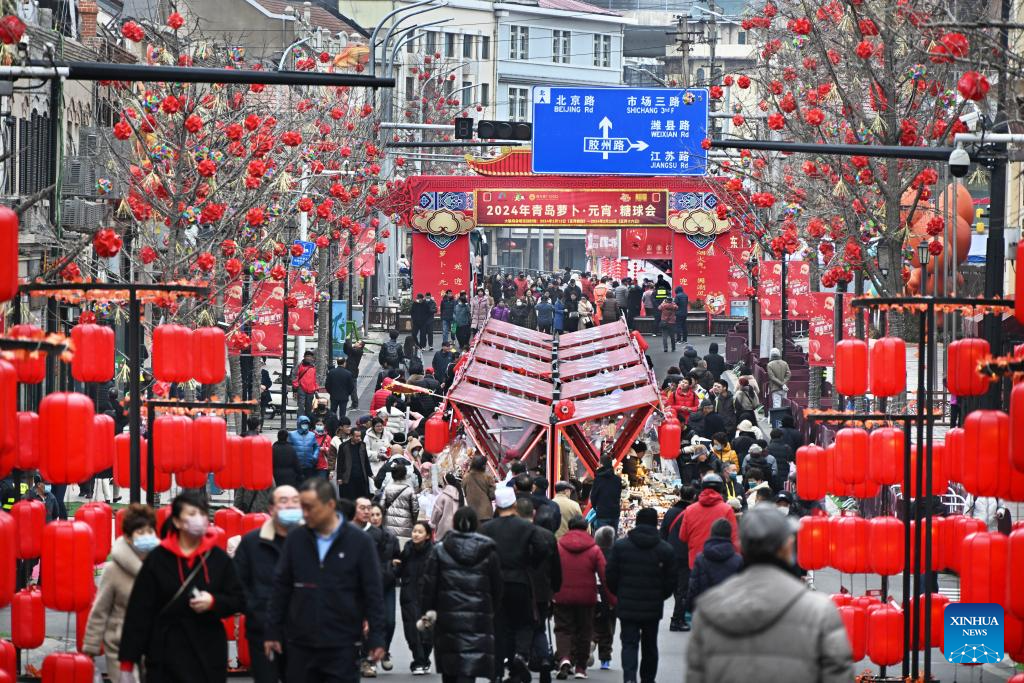 Tourists have fun during a fair in celebration of the Chinese Lunar New Year in Qingdao, east China's Shandong Province, Feb. 18, 2024. The fair featuring lantern show, dragon dance and specialty food attracted many tourists here. (Xinhua/Li Ziheng)