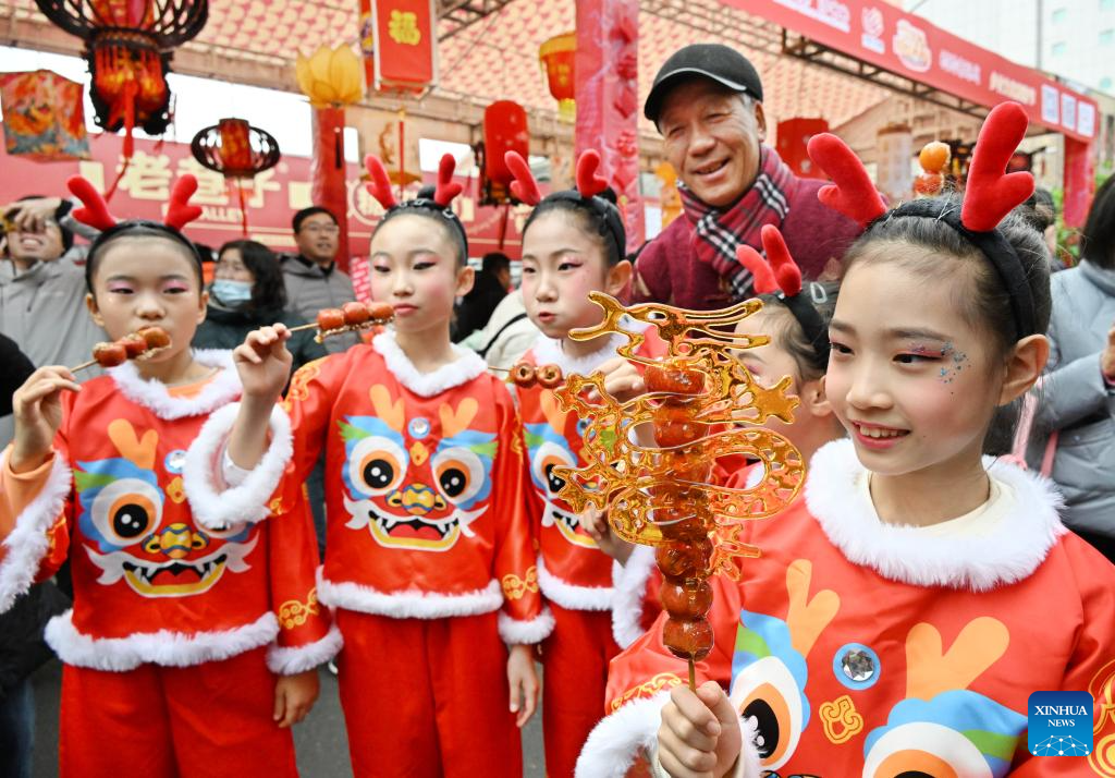 Children taste candied fruits during a fair in celebration of the Chinese Lunar New Year in Qingdao, east China's Shandong Province, Feb. 18, 2024. The fair featuring lantern show, dragon dance and specialty food attracted many tourists here. (Xinhua/Li Ziheng)
