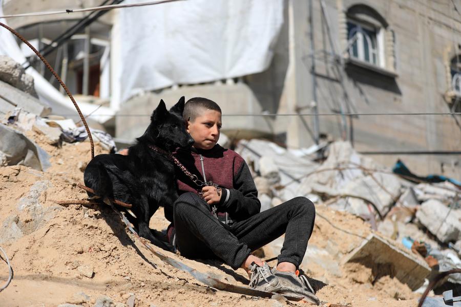 A boy sits with a dog beside the ruins in the southern Gaza Strip city of Rafah, Feb. 17, 2024. (Photo by Yasser Qudih/Xinhua)