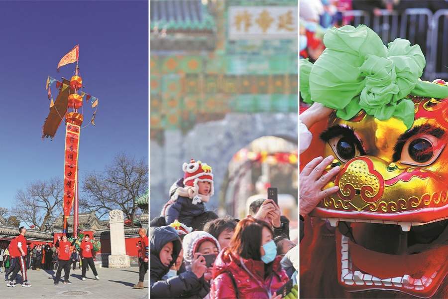 Visitors to the Taoist Dongyue Temple fair in Chaoyang district enjoy folk performances including zhongfan, a flagpole balancing act with amazing acrobatic feats, and lion and dragon dances. [JIANG DONG/CHINA DAILY]